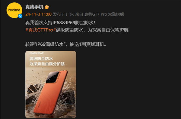 【TechWeb】短短几天,已经陆续有小米15系列、iQOO 13、一加13等多款骁龙8至尊版旗舰蜂拥入场,掀起了旗舰大战的狂潮。而在不久前,realme旗下新一代的旗舰机真我GT7 Pro也开始进入大家视野,同样将首批搭载骁龙8至尊版,将于11月4日也就是今天14:00发布,号称“挑战同档性能最强、影像最好的手机。”现在有最新消息,近日官方进一步晒出了该机在防尘防水上的更多细节。