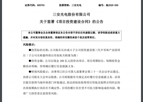 三安光电拟160亿元在长沙投资建设第三代半导体产业园快报