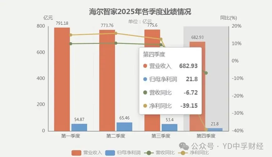 最令人警惕的是增长的阶段性失速,这种失速在四季度表现得尤为明显。分季度来看,2025年Q1、Q2、Q3归母净利润分别同比增长15.1%、15.6%、12%,前三季度保持稳健增长态势,但四季度却突然“变脸”:单季营收682.93亿元,同比下滑6.72%;归母净利润仅21.8亿元,同比暴跌39.15%,环比三季度更是大幅下滑59.17%,呈现断崖式下跌态势,这种极端的季度分化,绝非短期市场波动所能解释,更折射出公司增长动能的脆弱性。