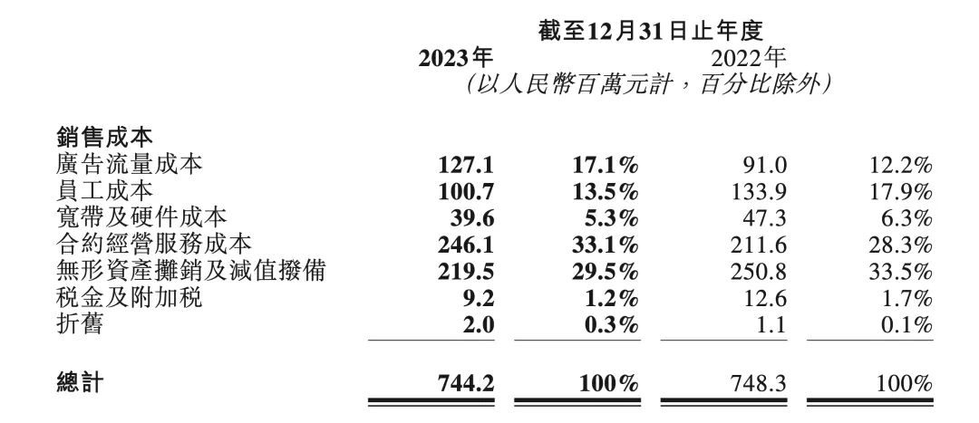 虽然营收与毛利率较上年均有所提升,但微盟集团仍面临盈利压力。实际上,过去一年,微盟集团的关键词依然是“省钱”。财报显示,2023年,微盟集团销售成本虽与2022年基本持平,但其中明显调整了员工成本、宽带及硬件成本等,但广告流量成本和合约经营服务成本出现了明显上涨,其中广告流量成本从2022年的0.91亿元增加至2023年的1.27亿元,合约经营服务成本由2022年的2.12亿元增加至2023年的2.46亿元。