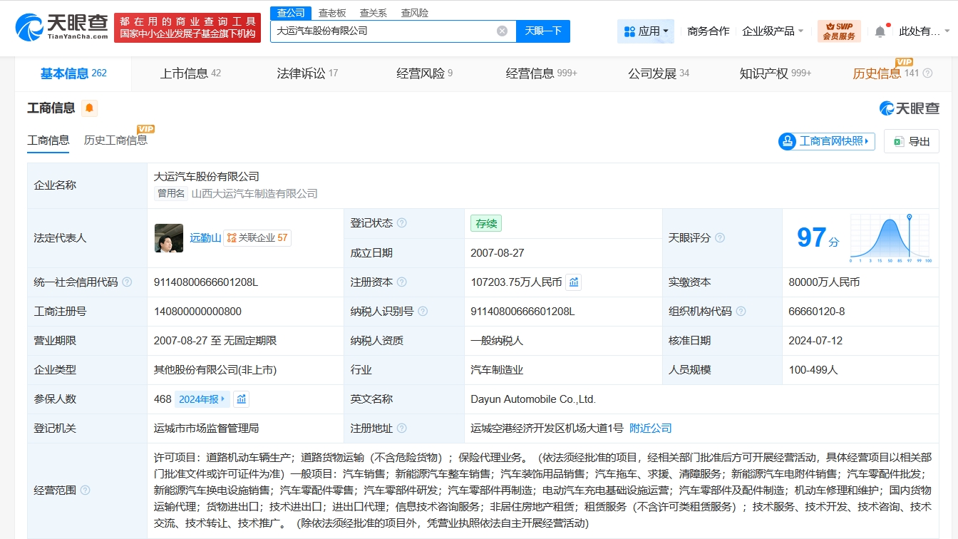 大运汽车股份有限公司成立于2007年8月,注册资本约10.7亿人民币,经营范围含道路机动车辆生产、保险代理业务、汽车销售、新能源汽车整车销售、汽车装饰用品销售、新能源汽车电附件销售、汽车零配件批发、新能源汽车换电设施销售等。股东信息显示,该公司由大运九州集团有限公司、大运集团有限公司共同持股。