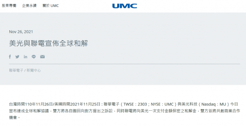 【TechWeb】11月26日消息,联华电子于官网发布公告称,联华电子与美光科技今日宣布达成全球和解协议,双方将各自撤回向对方提出之诉讼,同时联电将向美光一次支付金额保密之和解金,双方并将共创商业合作机会。