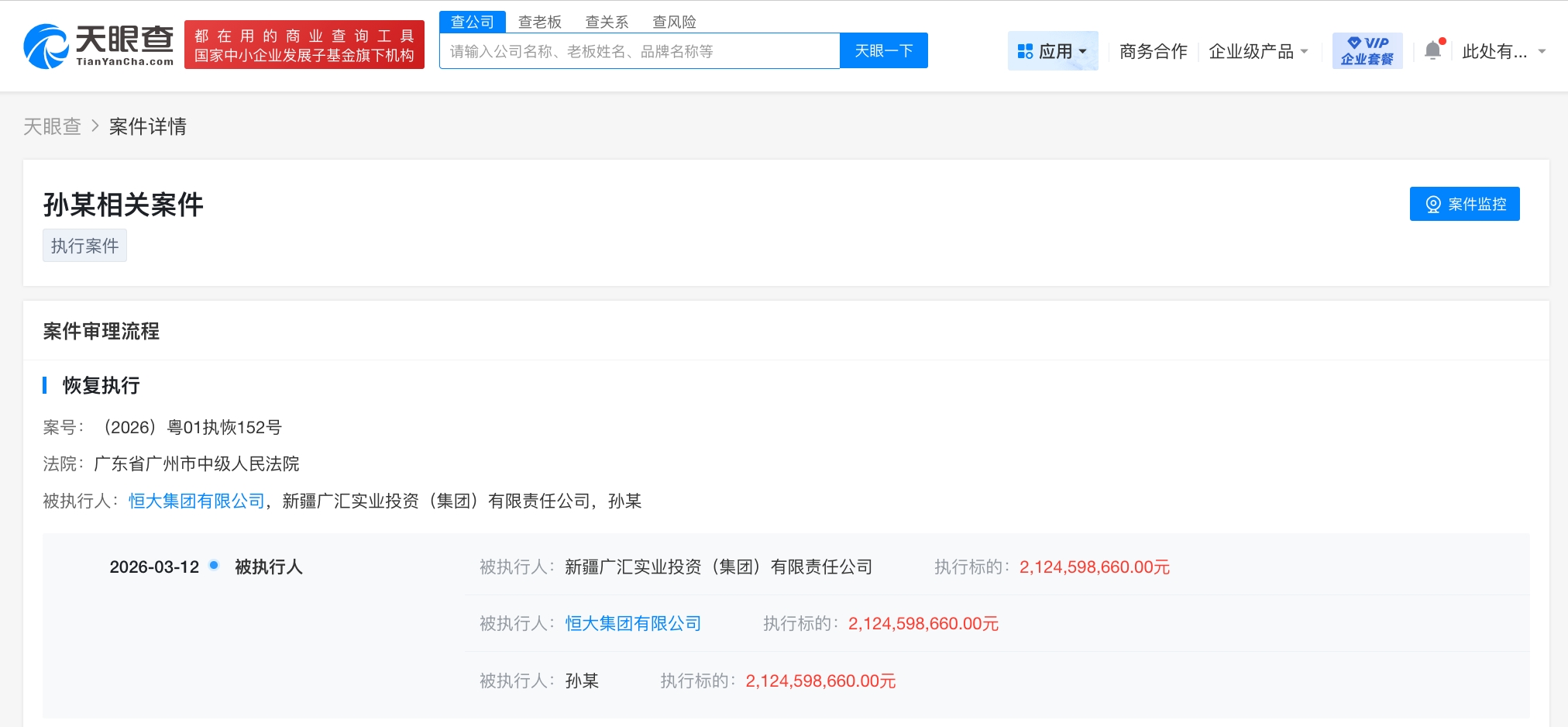 天眼查天眼风险信息显示,3月12日,恒大集团有限公司、新疆广汇实业投资(集团)有限责任公司等新增一条恢复执行信息,执行标的21.2亿余元,执行法院为广东省广州市中级人民法院。