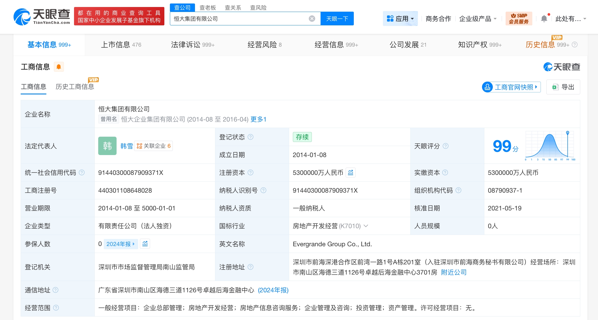 恒大集团有限公司成立于2014年1月,法定代表人为韩雪,注册资本530亿人民币。股东信息显示,该公司由广州市凯隆置业有限公司全资持股。天眼风险信息显示,该公司现存30余条被执行人信息,被执行总金额超50亿元,此外,该公司还存在多条失信被执行人(老赖)及终本案件信息。