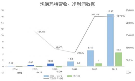 据其招股书显示,2017-2019年,泡泡玛特的营业收入分别约为1.58亿元、5.15亿元和16.83亿元,净利润分别为160万元、9950万元和4.51亿元。其中2018年和2019年的营收增幅分别为225.4%和227.2%,净利润增幅分别为6119%和353%,可谓“快速暴富”。