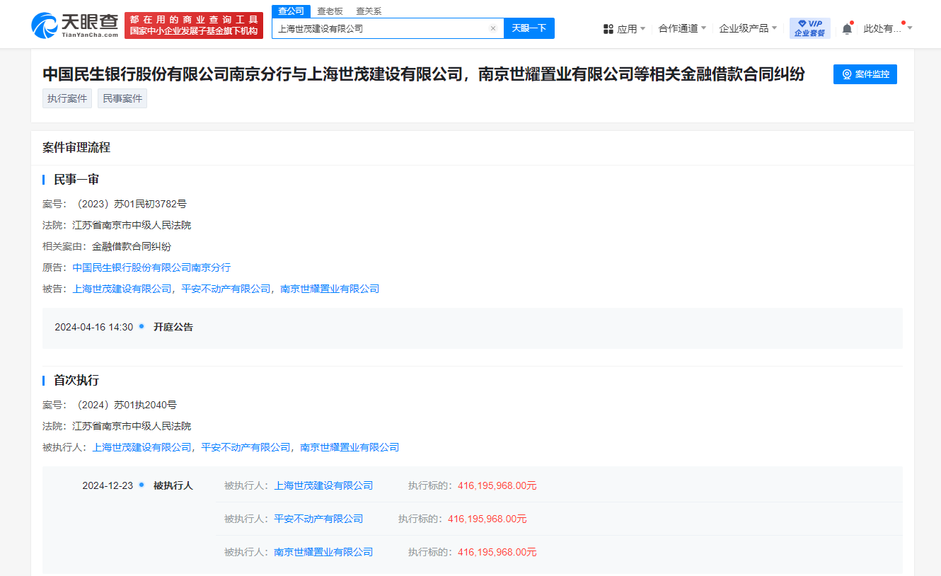 天眼查法律诉讼信息显示,近日,上海世茂建设有限公司新增2条被执行人及恢复执行信息,执行标的合计7.13亿余元,涉及金融借款合同纠纷等案件,被执行人还包括平安不动产有限公司、南京世耀置业有限公司、重庆恒顺圆实业发展有限公司,执行法院为江苏省南京市中级人民法院等。