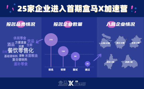 入营企业与盒马X加速器共同孵化的新品预计将于9月15日开营起,其他未入营企业也已经被纳入盒马X加速器品牌库,首批入选加速营的25家企业从报名的超200个企业、近300个品牌中。
