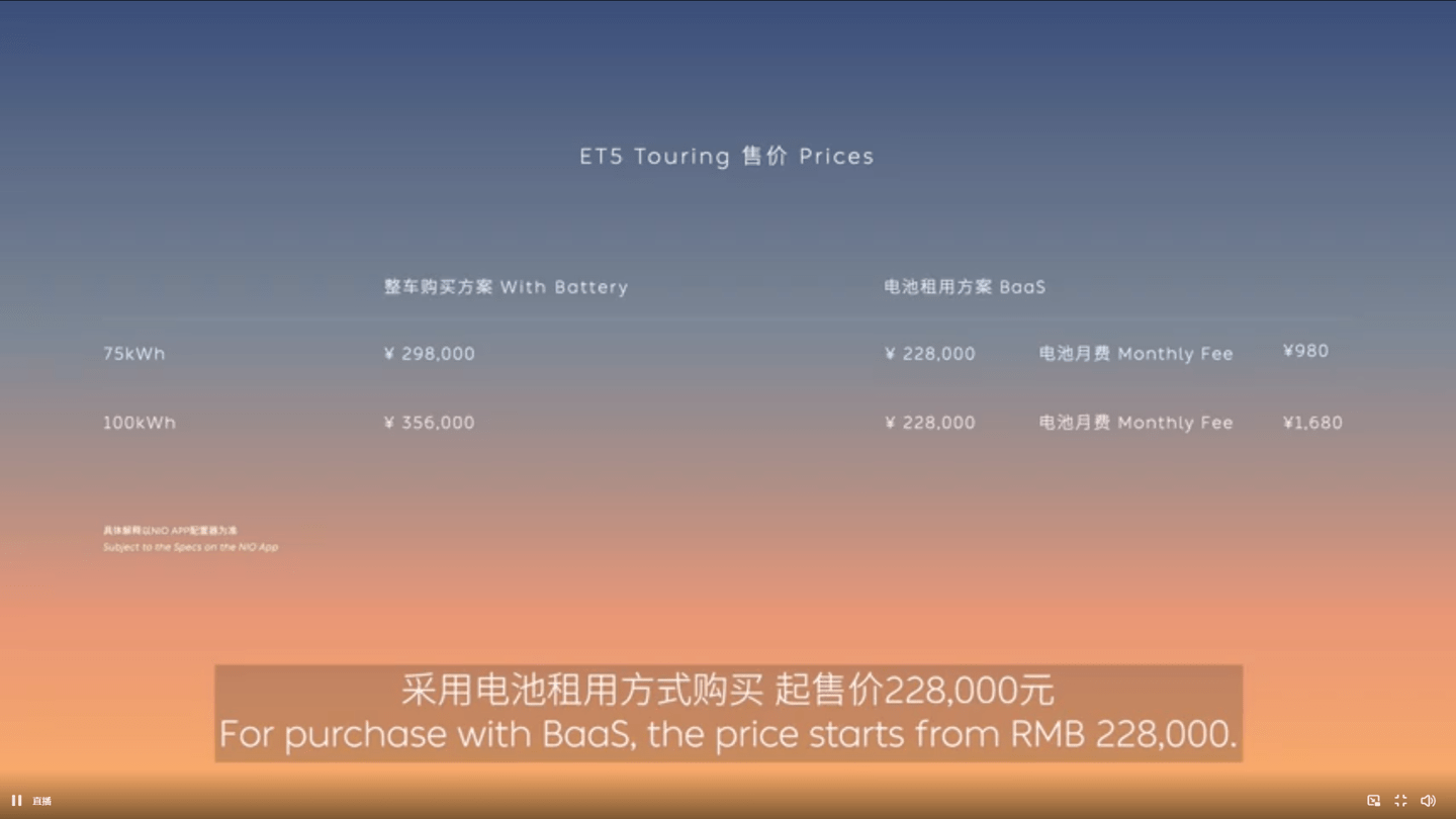 6月15日,蔚来汽车(NIO.US)发布了全球首款电动旅行车ET5。据介绍,蔚来ET5旅行版整车购买75度电车型售价为29.88万元,100度电车型售价为35.6万元,采用电池租用方式购买起售价为22.8万元,电池租用服务费75度电每月980元,100度电每月1680元。