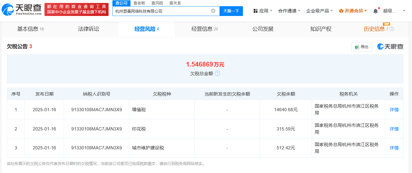 天眼查App显示,近日,杭州瑟曼网络科技有限公司新增3条欠税公告,欠税余额合计1.5万余元,欠税税种为城市维护建设税、增值税、印花税。