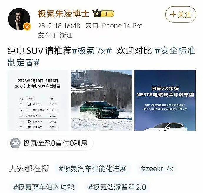 2月18日,极氪副总裁朱凌发布了2月10日-2月16日20万以上纯电SUV车型销量排行榜,极氪7X位列榜首,销量为0.15万辆。朱凌表示,“纯电SUV请推荐极氪7X,欢迎对比。”