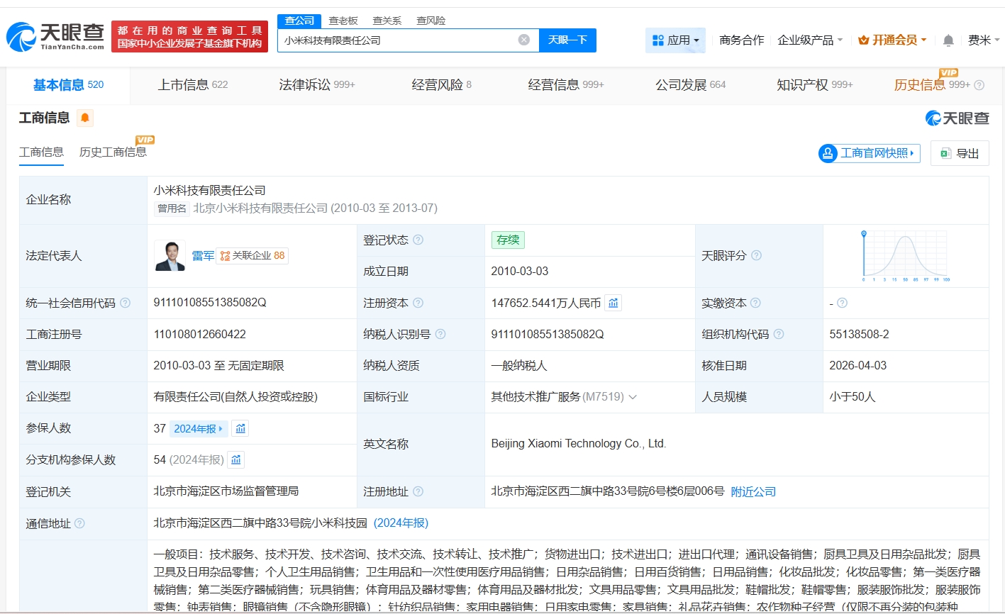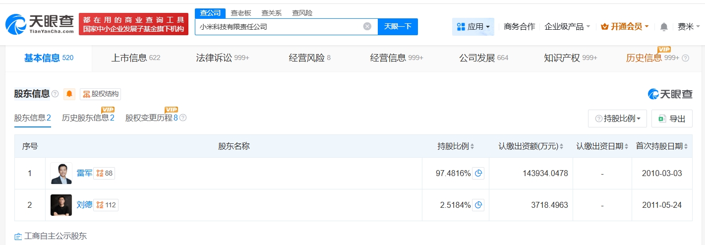 天眼查App显示,近日,小米科技有限责任公司发生工商变更,原股东小米联合创始人黎万强、洪锋退出,同时,注册资本由18.5亿人民币减至约14.8亿人民币。