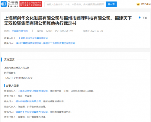 【TechWeb】企查查APP显示,近日,嘀哩嘀哩关联公司福州市嘀哩科技有限公司与多家公司其他执行裁定书公开,申请人为上海新创华文化发展有限公司。