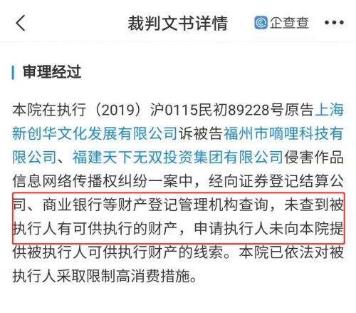 审理经过显示,嘀哩嘀哩公司涉侵害作品信息网络传播权纠纷,其名下已无财产可供执行。