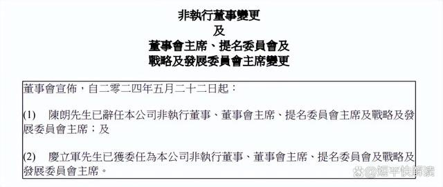 5月22日,因工作调整,陈朗辞任公司非执行董事、董事会主席、提名委员会主席及战略及发展委员会主席。董事会聘任庆立军接替陈朗相关职务。