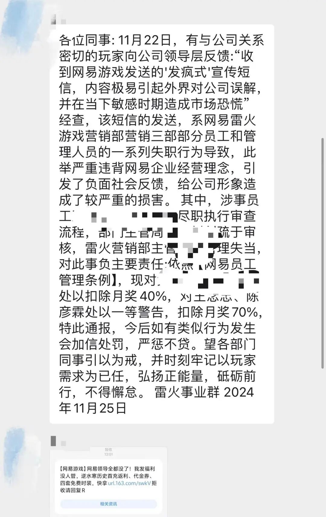 网易雷火员工因“发疯式”宣传短信被处理快讯