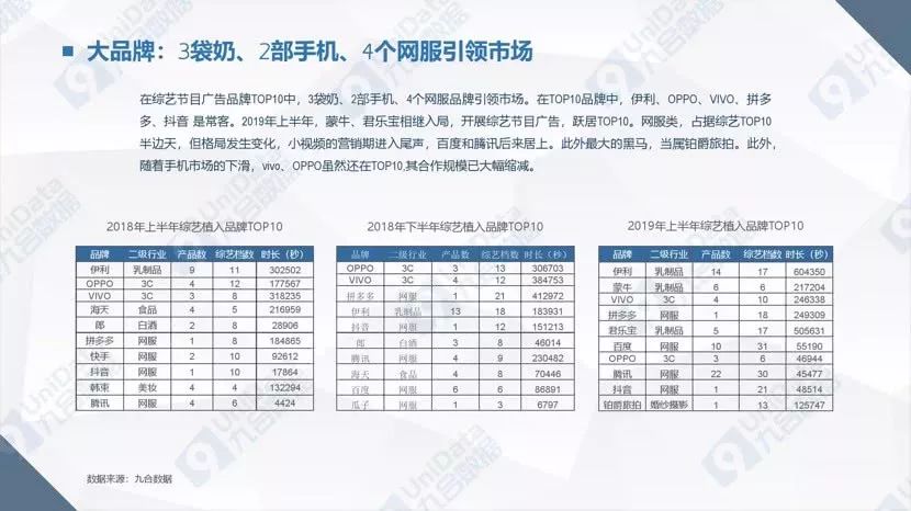 前述白皮书显示,在综艺节目广告品牌TOP10中,“3袋奶、2部手机、4个网服平台引领市场”。在TOP10品牌中,伊利、OPPO、vivo、拼多多、抖音是常客,但是“随着手机市场的下滑,vivo、OPPO虽然还在TOP10,其合作规模已大幅缩减”。