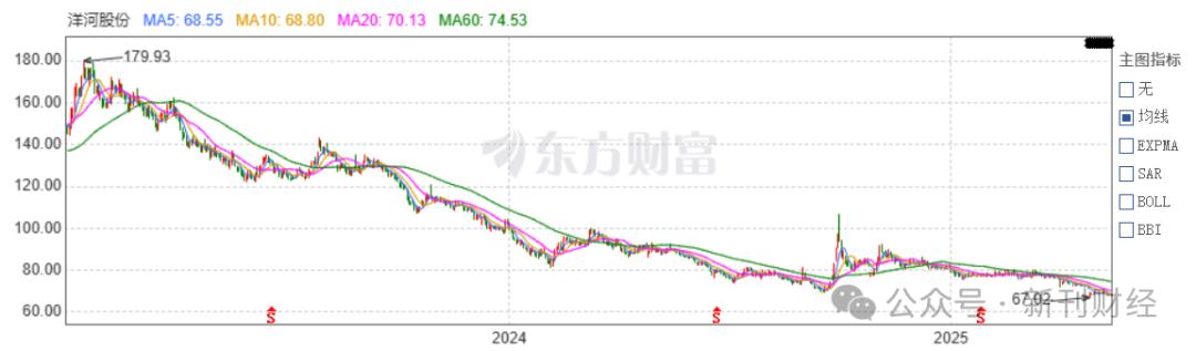 从资本市场表现来看,洋河股份似乎正经历着持续的价值重估。2025年开年以来,公司股价从80.75元持续下行,截至5月20日累计跌幅已达15.67%。若将观察周期拉长,其颓势更为显著,相较2023年初179.93元的高点,当前股价已累计下挫62.15%,远超同期行业平均跌幅。
