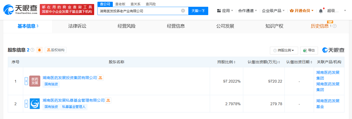 天眼查App显示,近日,湖南医发投养老产业有限公司成立,法定代表人为陈圳,注册资本1亿人民币,经营范围包括养老服务、护理机构服务、健康咨询服务、以自有资金从事投资活动等。股东信息显示,该公司由湖南医药发展投资集团有限公司及旗下湖南医药发展私募基金管理有限公司全资持股。