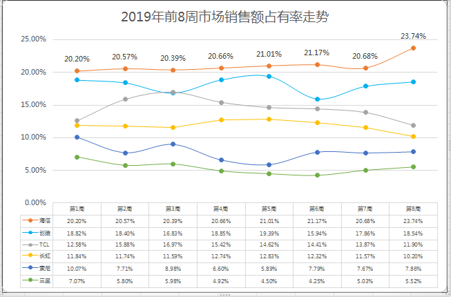 2019年开年,海信电视逆势而上,中怡康统计数据,今年开年以来,海信电视的周销售额占有率连续8周超过20%,第八周的销售额占有率高达23.74%,领先优势扩大。