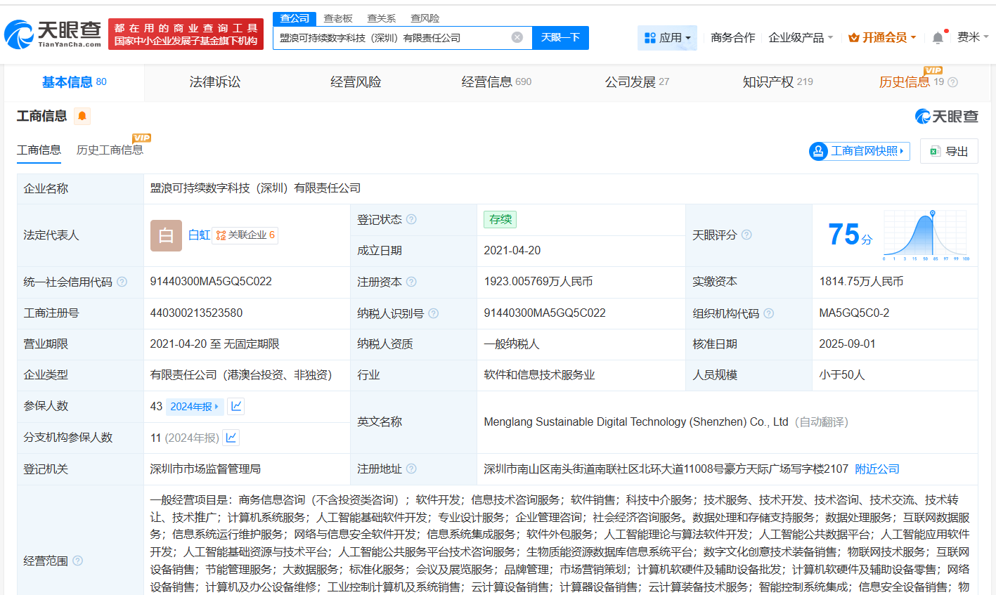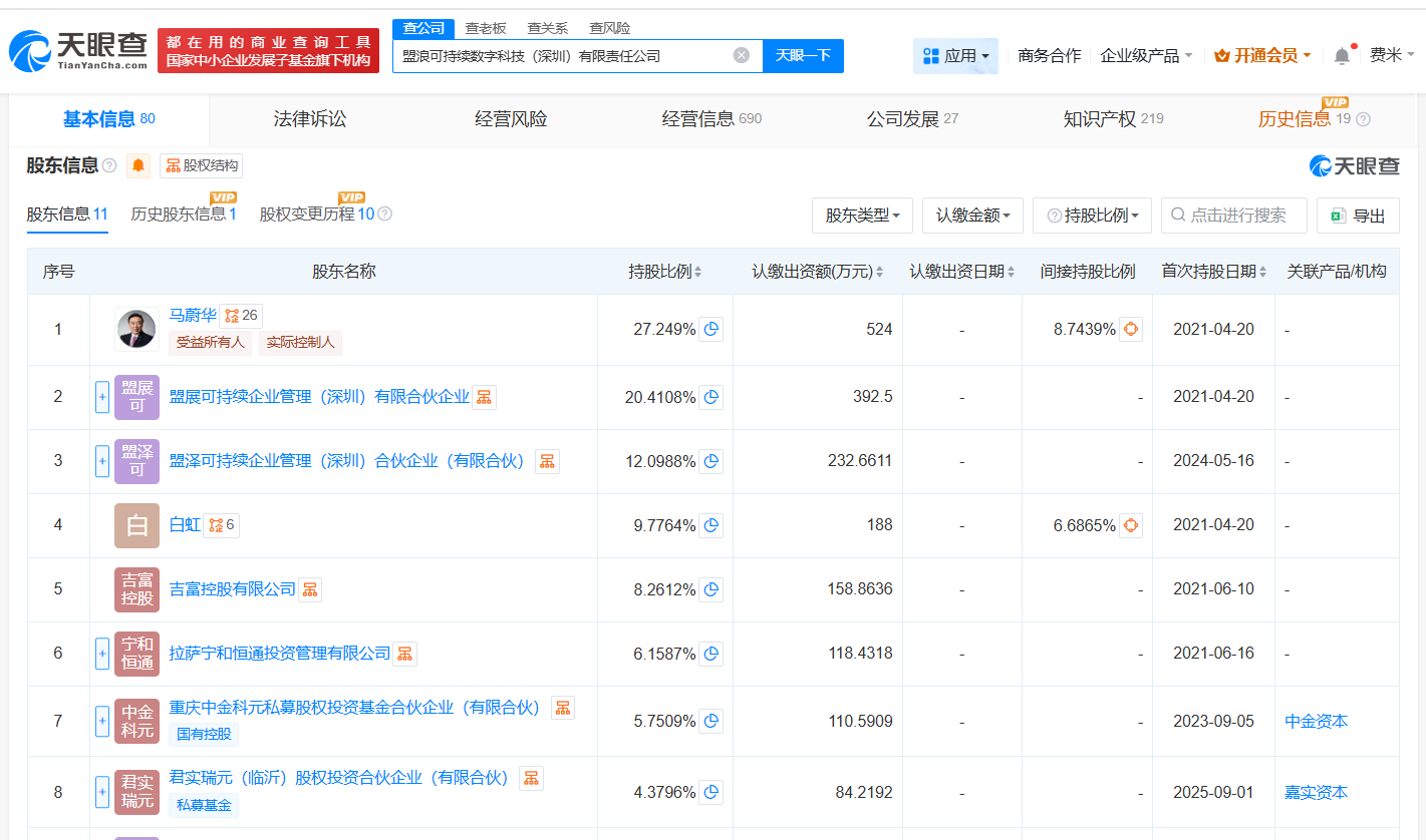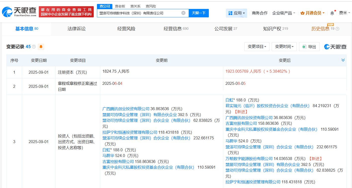 盟浪可持续数字科技(深圳)有限责任公司成立于2021年4月,法定代表人为白虹,经营范围包括软件开发、信息技术咨询服务、软件销售等。股东信息显示,该公司现由马蔚华、广西腾讯创业投资有限公司及上述新增股东等共同持股。公开资料显示,该公司是一家聚焦ESG及绿色金融领域做可持续发展价值量化评估的金融科技企业。