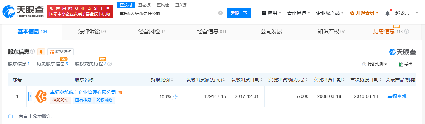 幸福航空有限责任公司成立于2008年3月,法定代表人为彭仕兵,注册资本约12.9亿人民币,经营范围包括通用设备修理、民用航空材料销售、针纺织品销售、服装服饰零售等,由幸福奥凯航空企业管理有限公司全资持股。据报道,此前,幸福航空被曝陷入欠薪风波,拖欠员工工资及社保,有在职飞行员、空乘人员等已做起包括做自媒体、直播带货、送外卖等各类兼职。