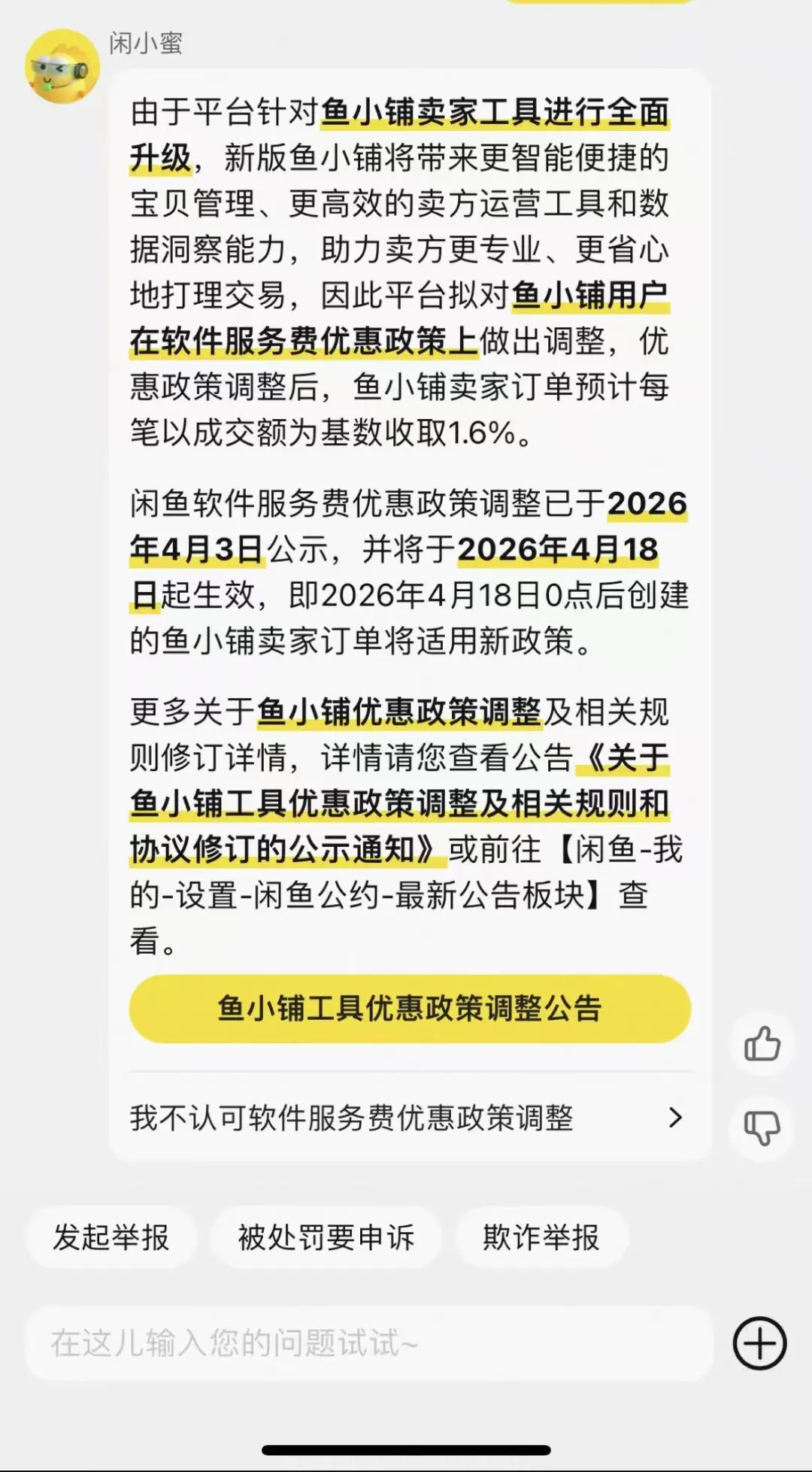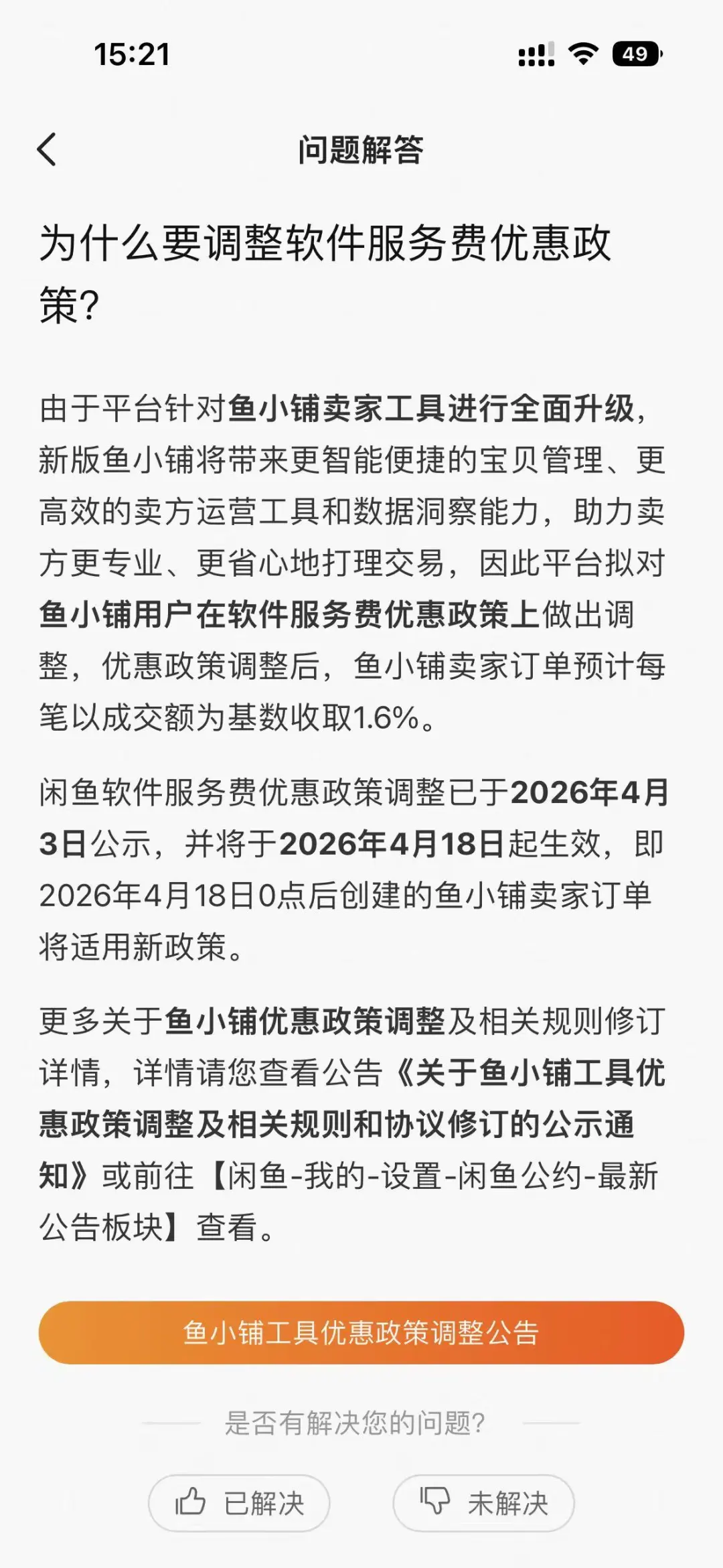 近日,闲鱼宣布自4月18日起,对鱼小铺卖家订单统一按成交额的1.6%收取软件服务费,取消此前所有优惠政策。