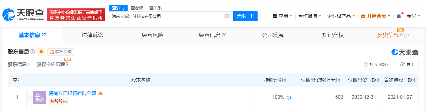海南立诚汇付科技有限公司、海南立赢健康科技有限公司分别成立于2021年1月、2021年11月,法定代表人均为陈丹娜,由立白集团旗下海南立白投资有限公司、广州立白科技集团有限公司分别持股。