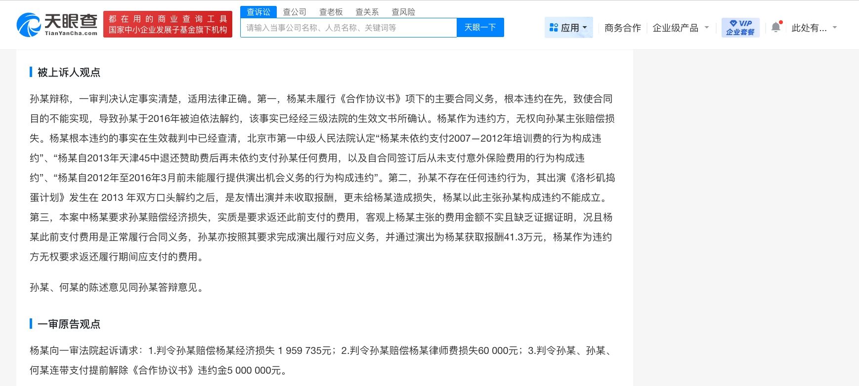 天眼查App显示,宋祖儿(原名孙凡清)曾因合同纠纷案件被前经纪人杨钧起诉,杨钧请求法院判决宋祖儿赔偿其经济损失195万余元、律师费6万元,违约金500万元。