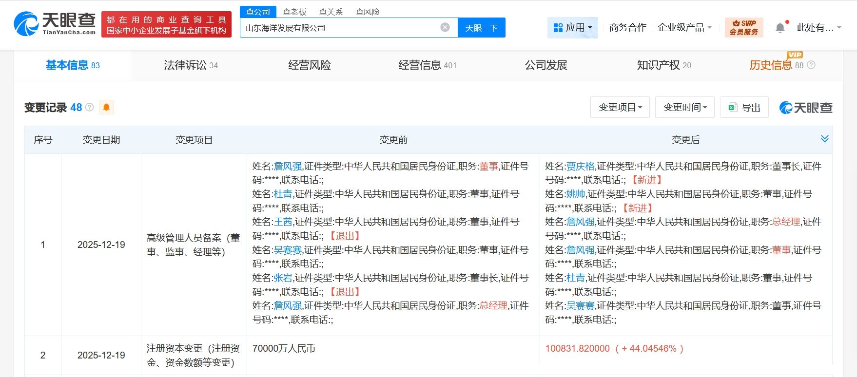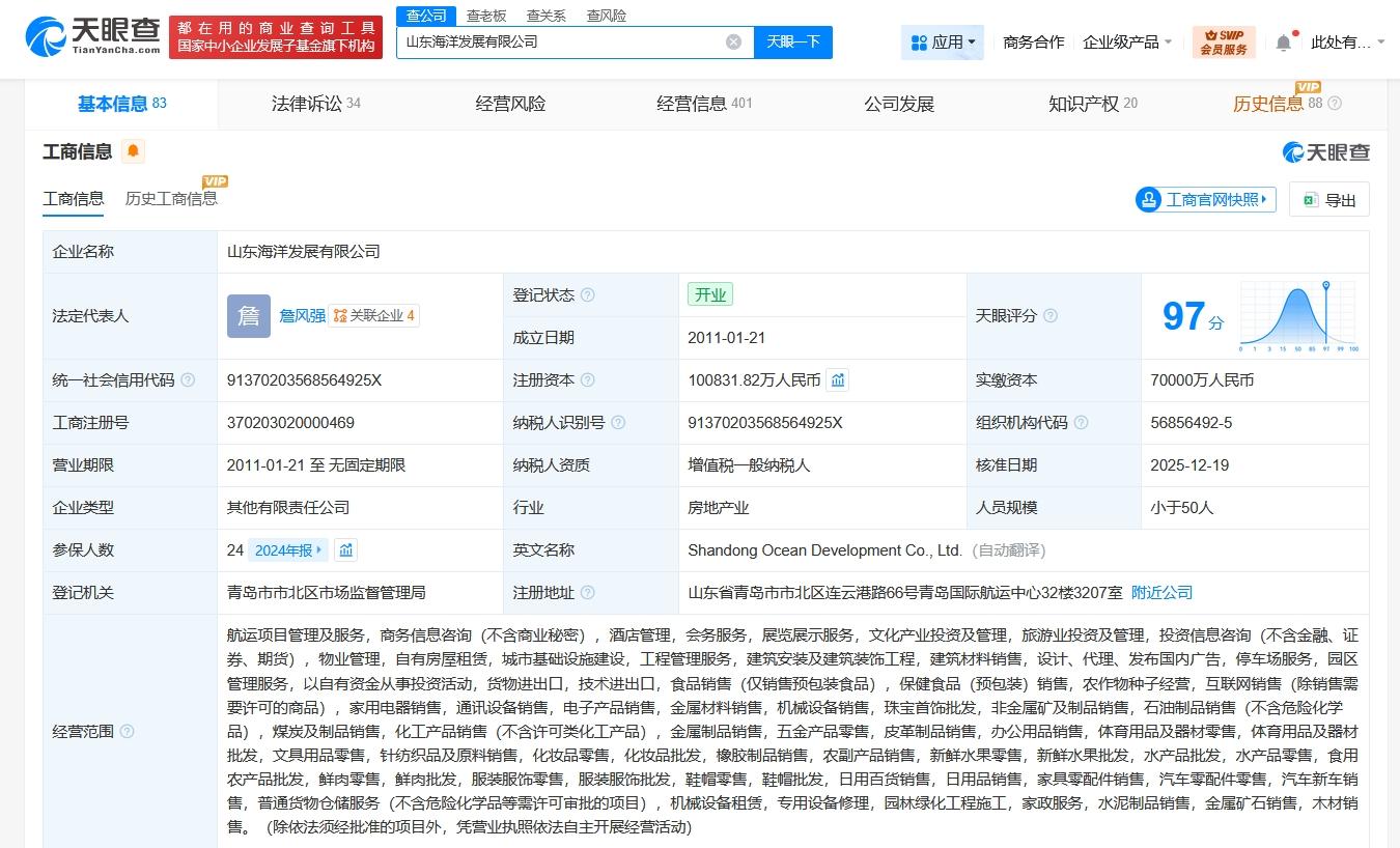 天眼查App显示,近日,山东海洋发展有限公司发生工商变更,注册资本由7亿人民币增至约10.1亿人民币,增幅约44%,同时,部分高管也发生变更。