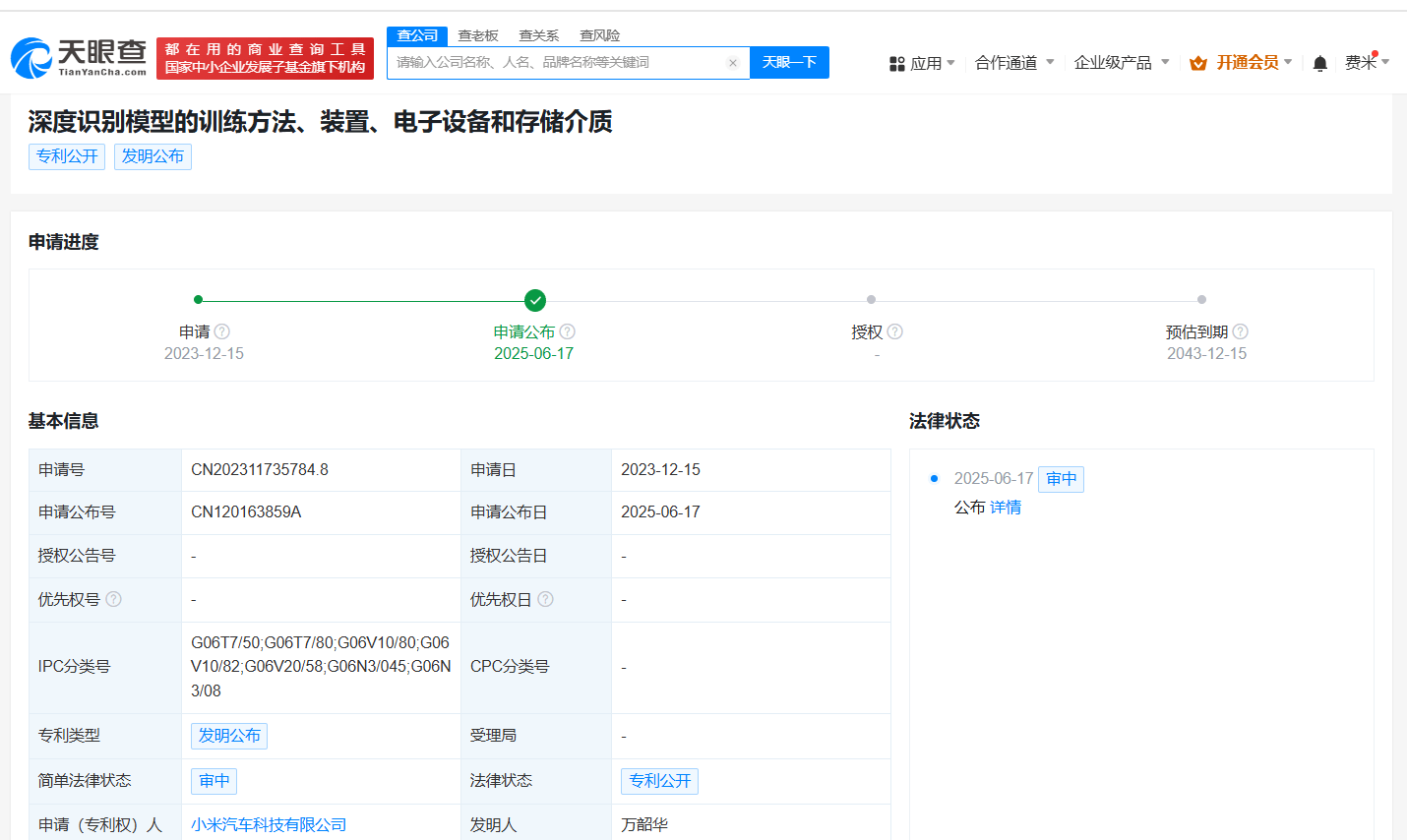 天眼查知识产权信息显示,近日,小米汽车科技有限公司申请的“深度识别模型的训练方法、装置、电子设备和存储介质”专利公布。