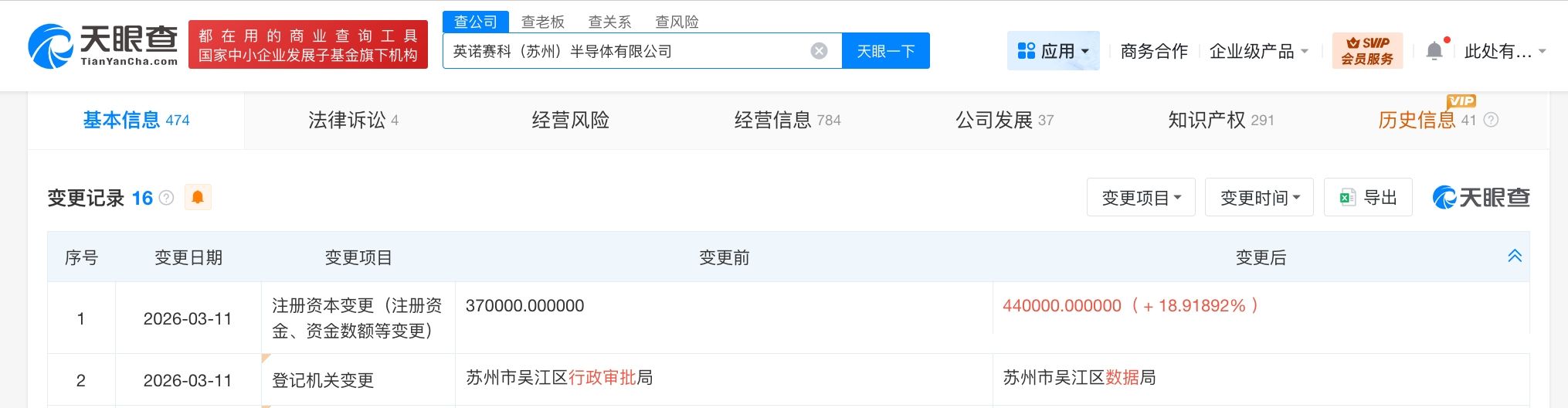 天眼查工商信息显示,近日,英诺赛科(苏州)半导体有限公司发生工商变更,注册资本由37亿人民币增至44亿人民币,增幅约19%。