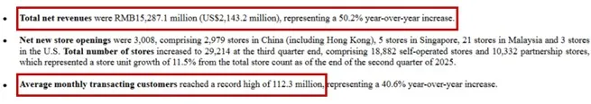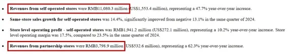 过度依赖外卖补贴带来流量增长的模式,导致其利润空间易受成本波动影响,而自营与联营门店的收入结构仍需进一步优化——第三季度自营门店收入110.80亿元,联营门店收入37.99亿元,后者增速虽远超前者,但盈利贡献仍有提升空间。若未来外卖补贴退潮,门店单量可能回落,而固定成本不会减少,瑞幸需要在规模和利润之间找到平衡。