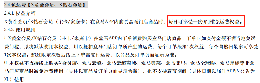 笔者查询盒马X会员权益协议发现,目前盒马会员免运费权益是“每日可享受一次0门槛免运费权益”,而此前则是每个月有31次免运费机会。