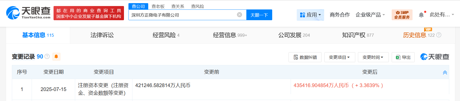 天眼查App显示,近日,深圳方正微电子有限公司发生工商变更,注册资本由约42.1亿人民币增至约43.5亿人民币,增幅约3%。