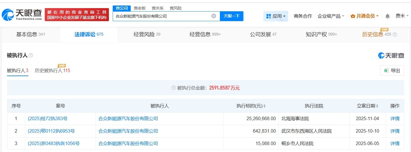 天眼查法律诉讼信息显示,11月4日,哪吒汽车关联公司合众新能源汽车股份有限公司新增一则被执行人信息,执行标的2526万余元,执行法院为北海海事法院。