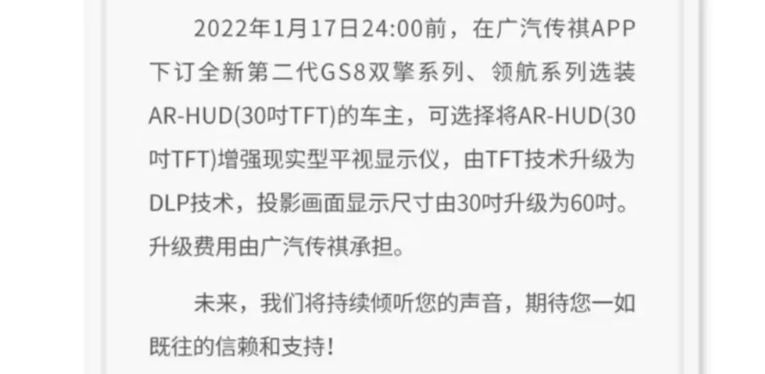 值得一提的是,这并非广汽传祺第一次在宣传与配置上“翻车”。早在2022年,第二代传祺GS8在预售时曾高调宣传采用与奔驰S级同款的DLP技术AR-HUD抬头显示,吸引大量车主花费5000元选装。然而车主提车后却发现,实车装配的竟是落后的TFT技术。虽然厂家事后反应迅速,承诺承担升级费用,但这一事件暴露出的质检漏洞令人细思极恐:如果无人发现,厂家是否会“将错就错”?连AR-HUD这种显而易见的配置都能出现如此低级的装配错误,那么在那些看不见的发动机内部、电路布局、车身结构中,质检流程是否也同样形同虚设?