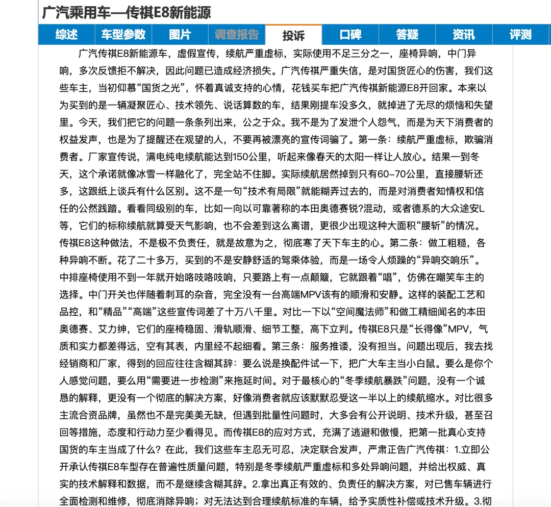 如果说影豹的问题集中在机械素质,那么传祺E8新能源MPV面临的则是更为严峻的诚信拷问。有E8车主公开发声,指控该车型存在严重的虚假宣传与品控缺陷。