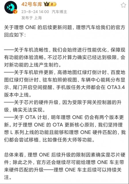 5TOPS的算力是否够用,从搭载征程3的理想one停止更新的回复中可见一斑。174万粉博主称,理想在车机流畅性问题上,会始终进行性能优化,保障现有功能的体验流畅。不过芯片算力确实已经达到极限,会对新功能的上线产生制约。