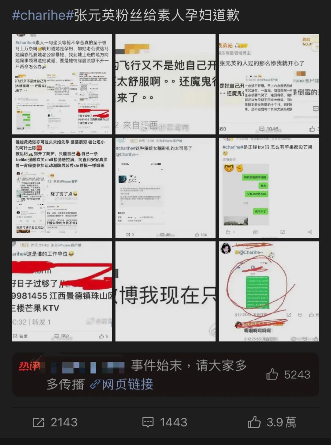 微博用户@妳的眼眸是世界上最小的湖泊(以下简称“眼眸”) 是引发风波的核心人物,她是张元英的粉丝。“眼眸”将这名网友的姓名、电话、住址、工作恶意曝光,诅咒、威胁、谩骂也紧随其后。