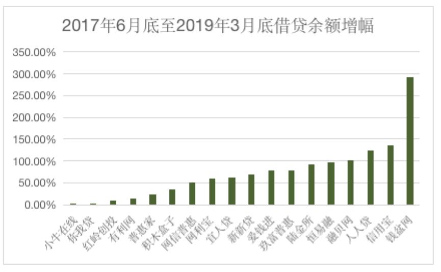 总体来看,2019年3月较2017年6月增长有19家,其中增长最多的为花虾金融,增长率1363.43%。除花虾金融外增长幅度在100%以上的有4家平台,融贝网101.85%,人人贷123.51%,信用宝134.97%,钱盆网291.36%。目前借贷余额排名前十的平台,较2017年6月后都有大额增幅。