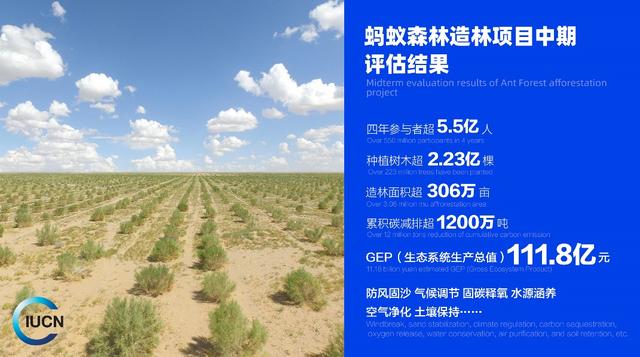 9月26日,在上海举行的”外滩大会”科技公益论坛上,世界自然保护联盟IUCN公布了《蚂蚁森林造林项目生态价值评估》的中期结果:2016年至今,蚂蚁森林造林超过2.23亿棵,造林面积超过306万亩,当所属区域植被达到成熟状态时,GEP(生态系统生产总值)可达111.8亿元人民币,评价指标里包括防风固沙、气候调节、固碳释氧、水源涵养等方面。