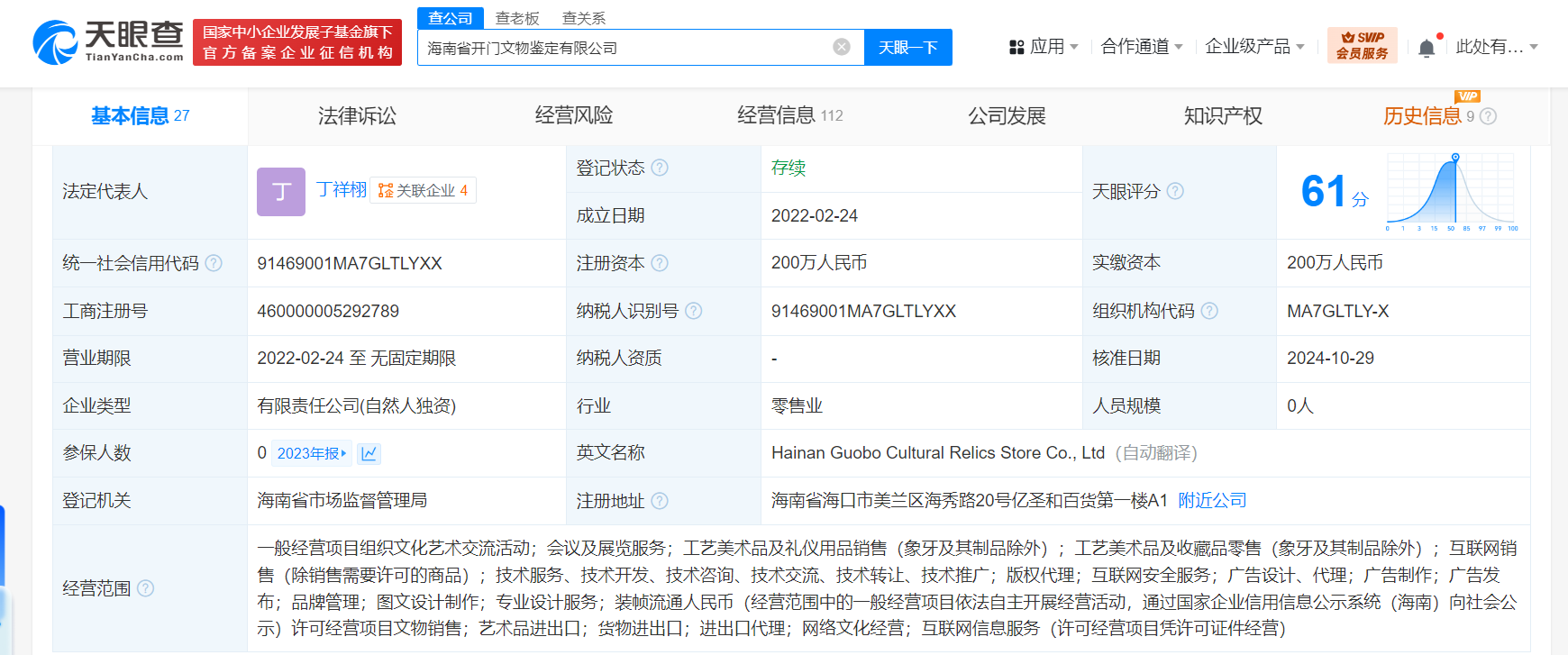 该公司成立于2022年2月,法定代表人、执行董事兼总经理为丁祥栩(听泉赏宝),注册资本200万人民币,经营范围含文物销售、艺术品进出口、工艺美术品及收藏品零售、互联网销售、版权代理等,由丁祥栩全资持股。据悉,“听泉赏宝”在直播中经常会提到“很开门”等暗语。
