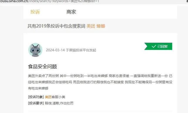 小雪吃到蟑螂并非孤例。雷达财经以“美团+蟑螂”为关键词,在黑猫投诉上更检索出2019条结果。