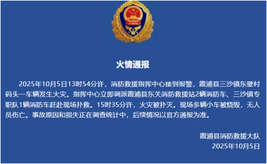 10月5日23时49分,福建省宁德市霞浦县消防救援大队发布火情通报,通报内容显示:当日13时54分左右,消防救援指挥中心接到报警,称霞浦县三沙镇东壁村码头有一辆车辆起火。指挥中心随即调派霞浦县东关消防救援站的2辆消防车,以及三沙镇专职消防队的1辆消防车赶赴现场开展扑救工作。至15时35分左右,现场火灾被成功扑灭。此次事故造成现场多辆小轿车烧毁,幸运的是未出现人员伤亡情况,目前事故具体原因及财产损失仍在进一步调查统计中。