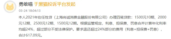 一名借款人披露了尚诚消费金融旗下“任性贷”的四笔贷款记录:1,500元分10期、2,000元分12期、2,500元分12期、1,500元分12期。依据监管红线,利息、担保费与罚息合并计算的年化利率不得超过24%,超限部分法律不予保护。经该用户核算,其四笔贷款实际综合年化利率均突破24%上限。追讨617.09元多收款项,是消费者依据法律享有的正当权益。