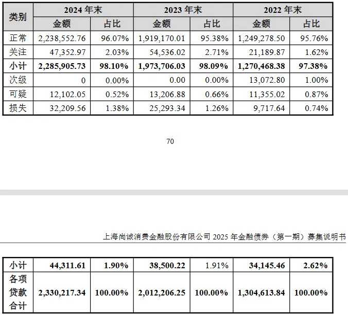 财报数据显示,2022年至2024年,尚诚消费金融不良贷款余额从3.41亿元增至4.43亿元,三年净增超1亿元。尽管2024年不良贷款率微降至1.90%,但关注类、可疑类、损失类贷款合计达9.17亿元,其中关注类贷款4.47亿元,而关注类贷款向来是资产质量恶化的重要前兆。