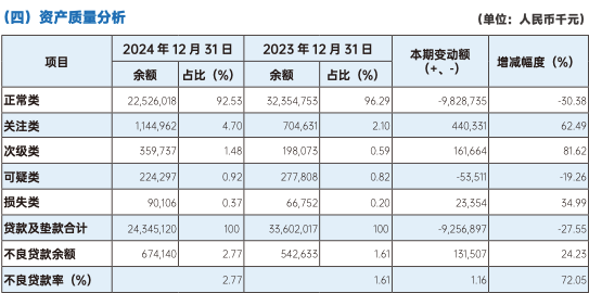 亿联银行资产质量也逐渐承压,2022年至2024年不良贷款率上升1.16个百分点至2.77%,在19家民营银行中,其不良贷款率处于行业末位水平。值得关注的是,该行关注类、次级类、损失类贷款余额均呈现增长态势,其中不良贷款余额较上年同期增幅达 24.23%,资产质量管控压力进一步凸显。