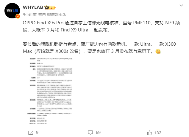 据知名数码博主@WHYLAB 最新发布的信息显示,近日OPPO Find X9s Pro 通过国家工信部无线电核准,型号为PME110,支持N79频段,大概率3月和Find X9 Ultra一起发布。据悉,影像是该机的一大卖点,将后置横向大矩阵相机DECO,包含三颗摄像头,分别为2亿像素主摄、2亿像素潜望长焦以及5000万超广角,这是Pro档唯一双2亿像素旗舰,对比上代Pro,其影像能力有了大幅提升。除此之外,该博主还表示,春节后的旗舰机都挺有看点,蓝厂那边也有两款新机,一款Ultra,一款X300 Max(应该就是X300s改名),要是也放在3月发布就有意思了。