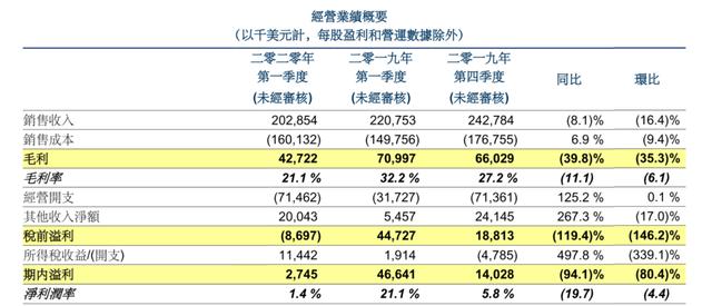 销售收入为2.029亿美元,同比下降8.1%,环比下降16.4%;实现净利润270万美元,同比下降94.1%,环比下降80.4%。