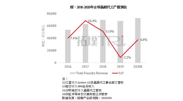 实际上,如果着眼全球市场,受半导体产业周期性波动影响,2019年全球晶圆代工厂产值就出现了全面下滑,整体下滑2.2%。